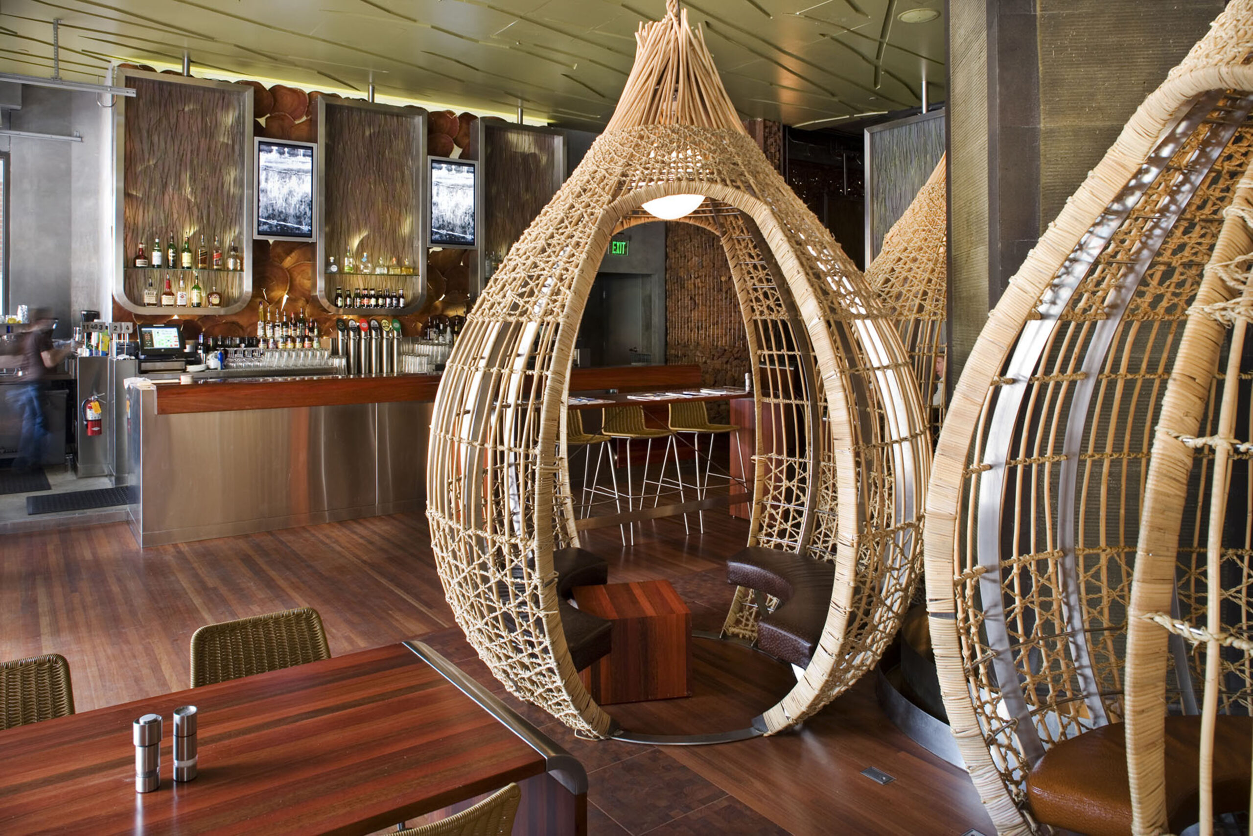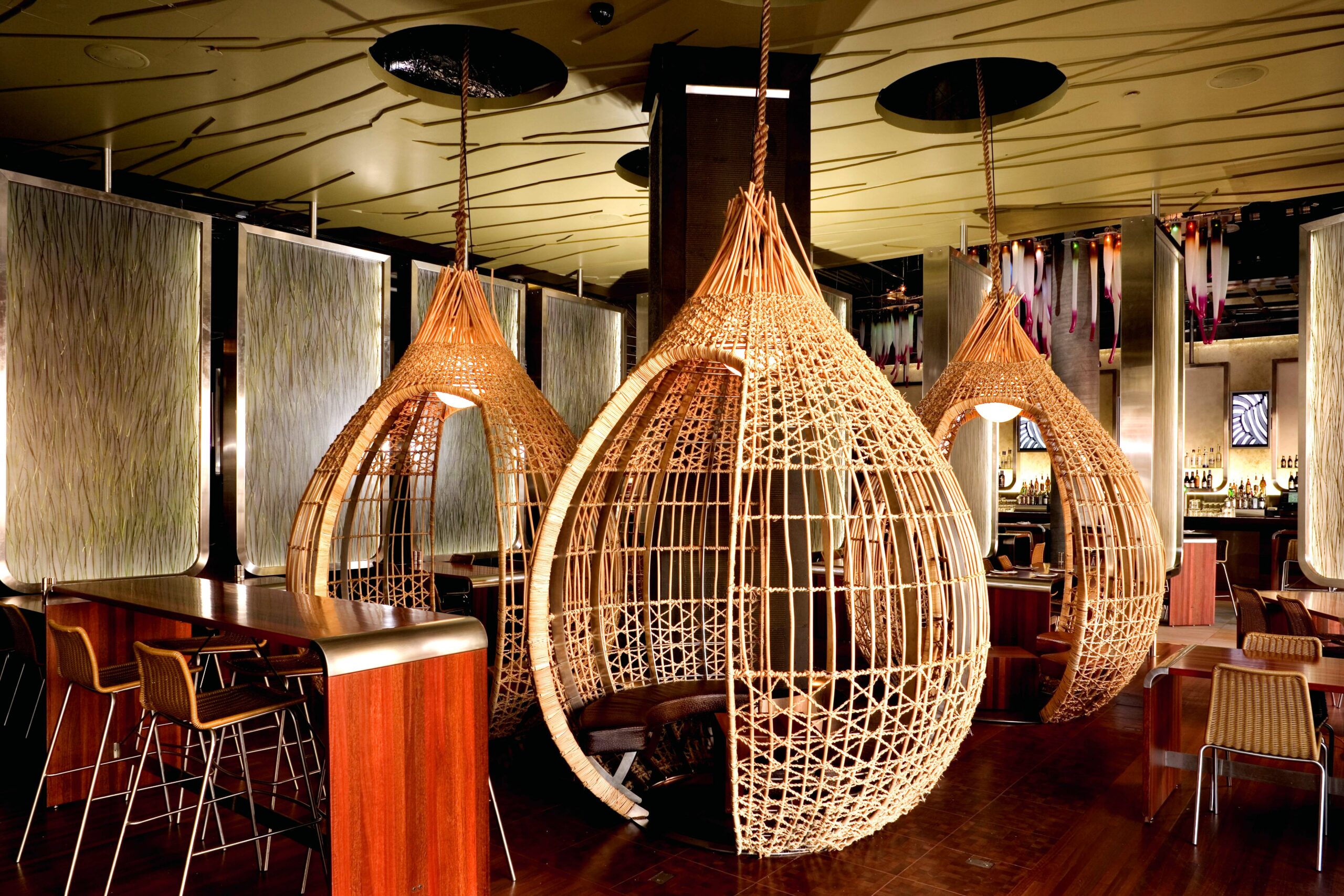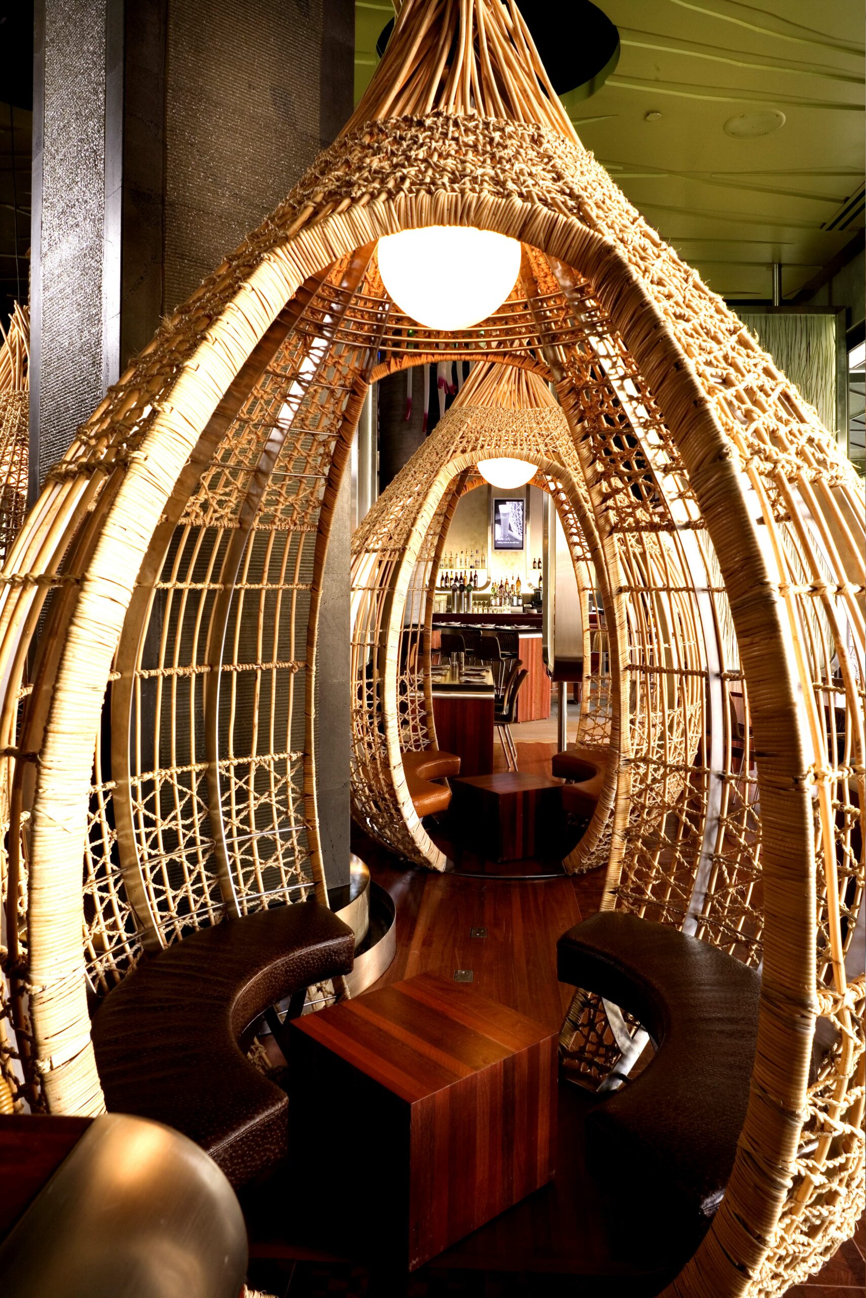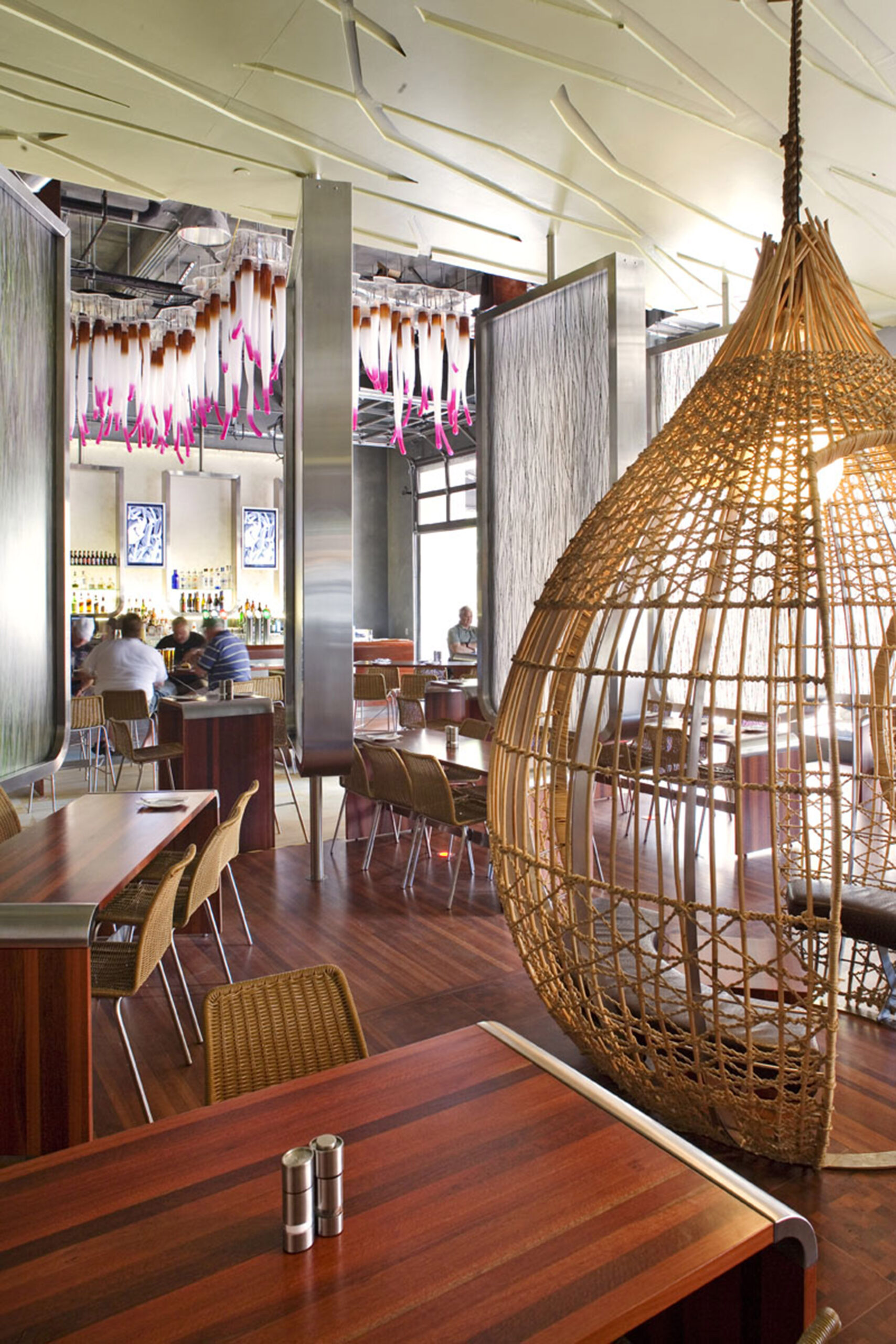 The ”Bondi” cafe concept based on Australian ”Billabong” serves as the central zone within the entire Bondi experience. Acting as an intermediary between the bar and restaurant, it serves breakfast through to dinner. Patrons can lounge in the custom suspended fish traps and then follow up with an Aussie beer or two into the late hours of the night where the fish traps recline into the ceiling and act as a beacon of light in the night sky. The stainless steel fish traps are woven to produce distinctive, raw forms and repetition of patterning, loosely based on the traditional fish traps. Distinct features in this space include fish trap inspired booth seating and grass tree log wall finishes which fabricate the environmental aspect which Australia contributes to. The common materials used throughout the cafe are jarrah wood floors and acrylic grass screens that pivot to separate the cafe and dining areas.