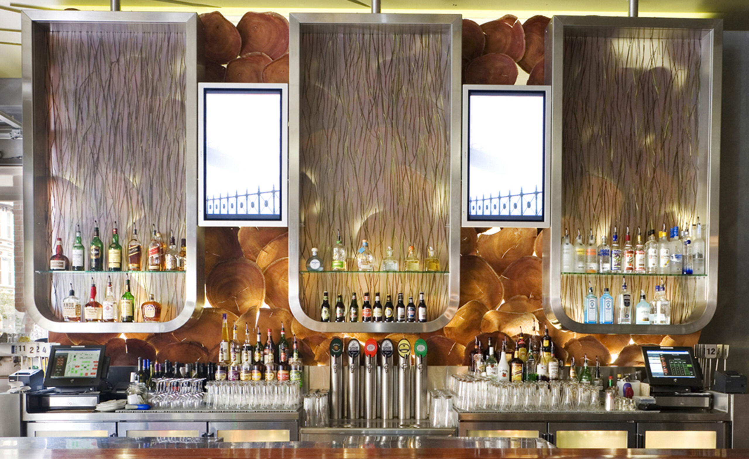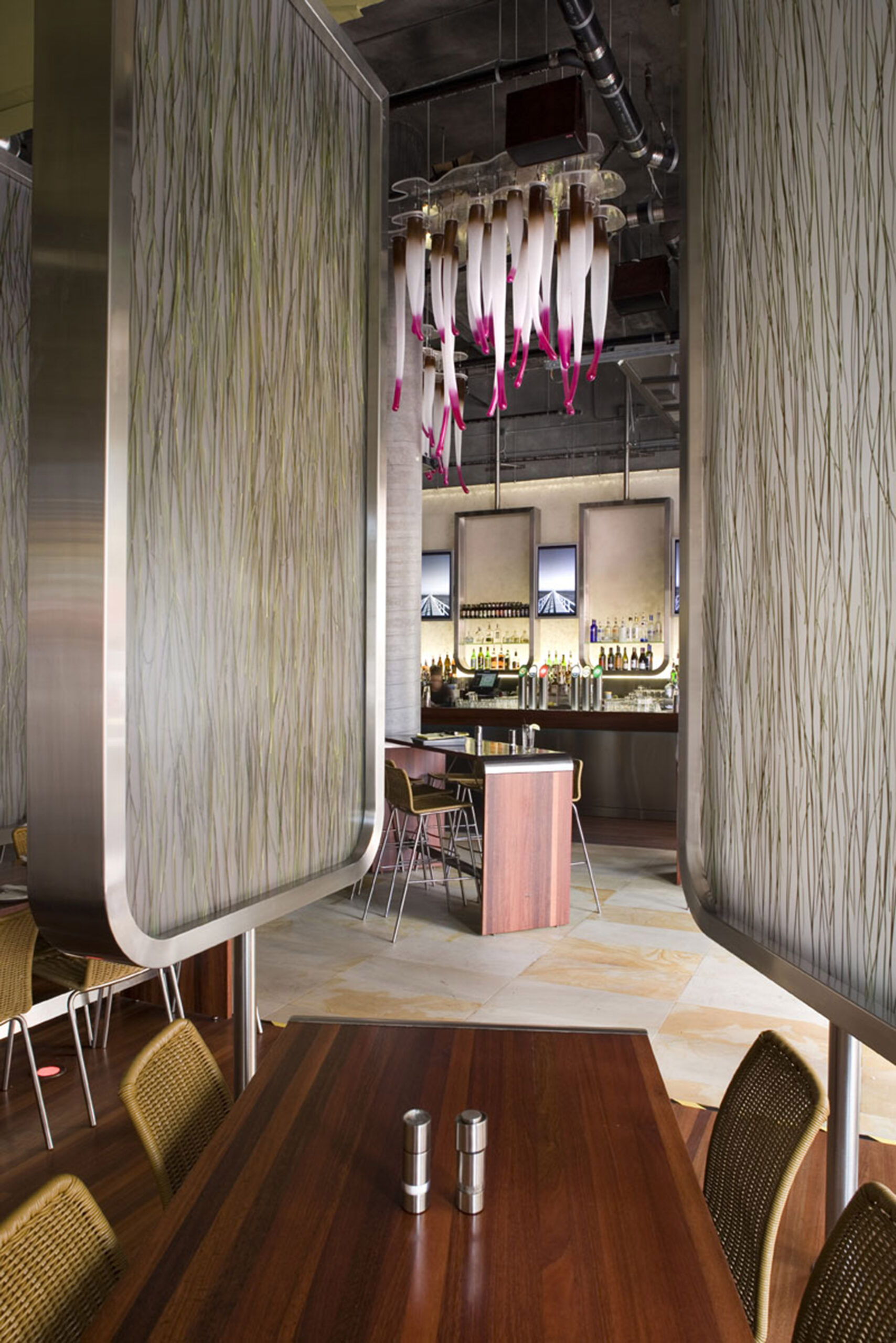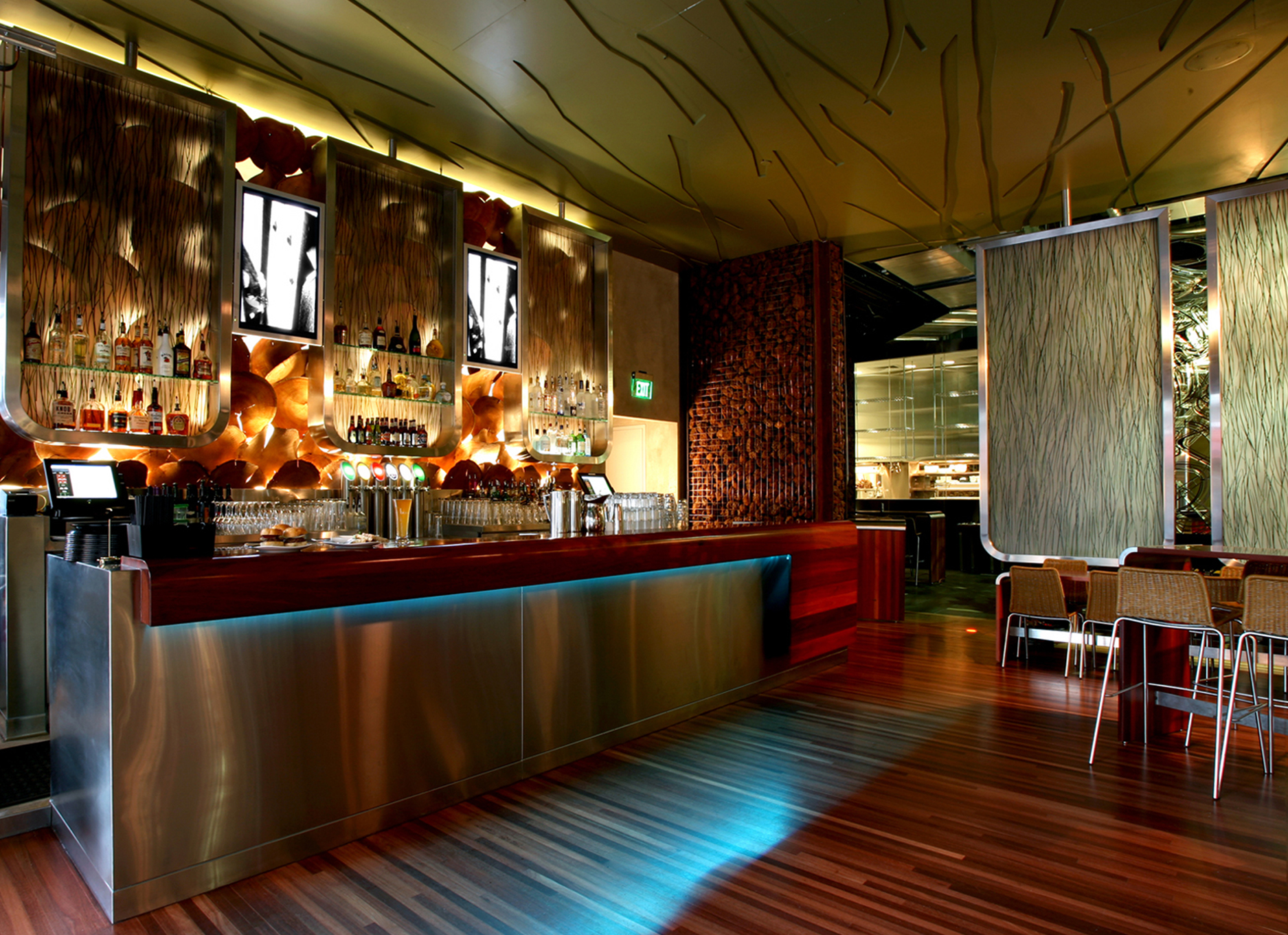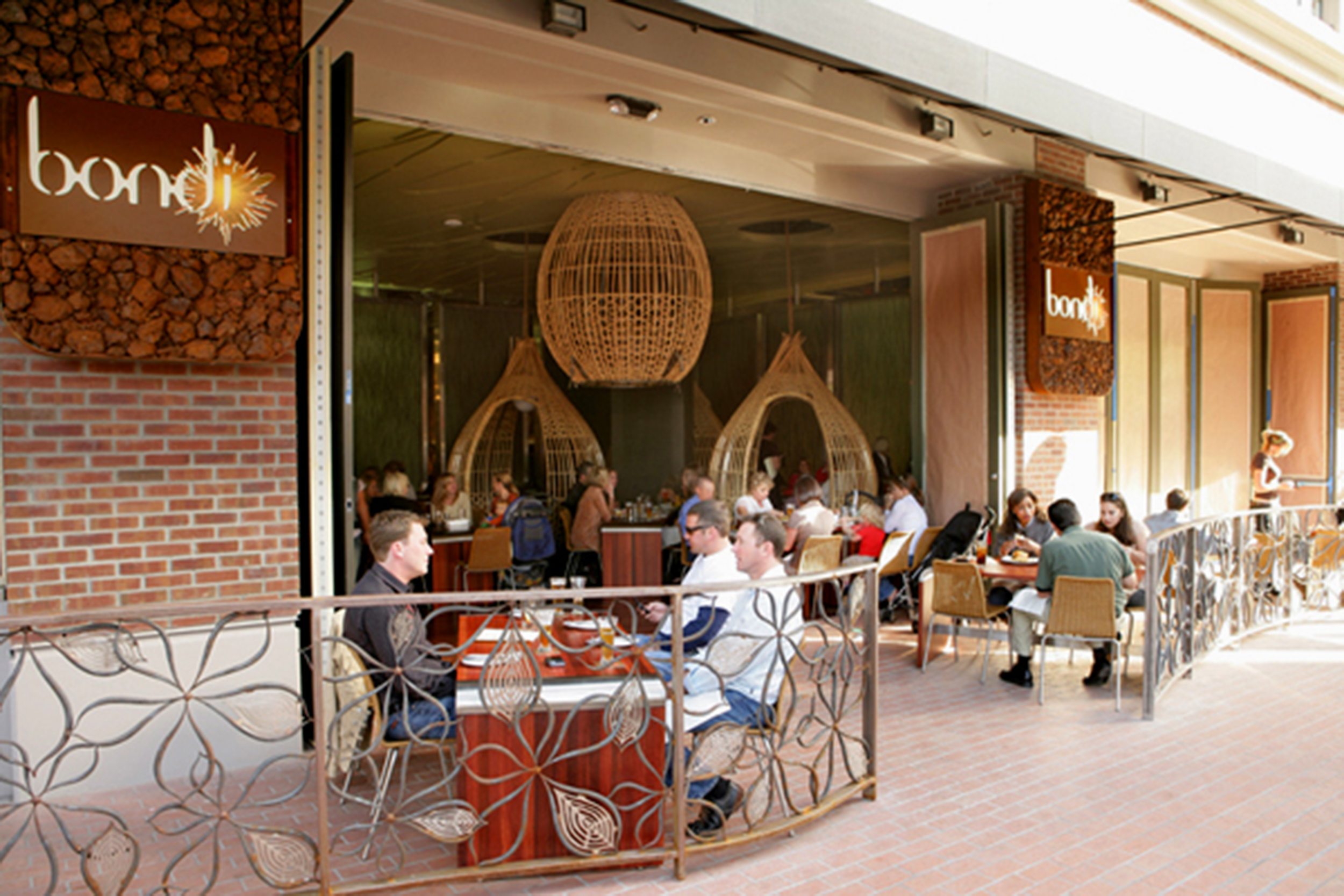The ”Bondi” cafe concept based on Australian ”Billabong” serves as the central zone within the entire Bondi experience. Acting as an intermediary between the bar and restaurant, it serves breakfast through to dinner. Patrons can lounge in the custom suspended fish traps and then follow up with an Aussie beer or two into the late hours of the night where the fish traps recline into the ceiling and act as a beacon of light in the night sky. The stainless steel fish traps are woven to produce distinctive, raw forms and repetition of patterning, loosely based on the traditional fish traps. Distinct features in this space include fish trap inspired booth seating and grass tree log wall finishes which fabricate the environmental aspect which Australia contributes to. The common materials used throughout the cafe are jarrah wood floors and acrylic grass screens that pivot to separate the cafe and dining areas.