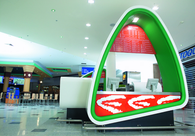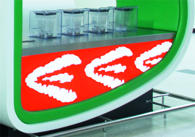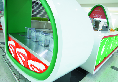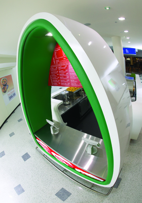 The project brief was to develop a new retail concept and form of identity branding for a chain of fruit juice stores that focused on the sale and “fast food production” of fruit and vegetable juices, smoothies and blends. During the course of our research, market evidence suggested that a predominately female niche market existed and hence a retail identity that portrayed a feminine, organic and curvy nature of self expression evolved. The materials selected for the final design aimed at replicating the textures found on fruit skins and largely concentrated on the differing layers of a cross-section of a single piece of fruit. The funky nature of the free form counters were produced by combining alternating, vibrantly-coloured upholstered vinyl fabric trim to white, lacquer-finished custom wood counters.