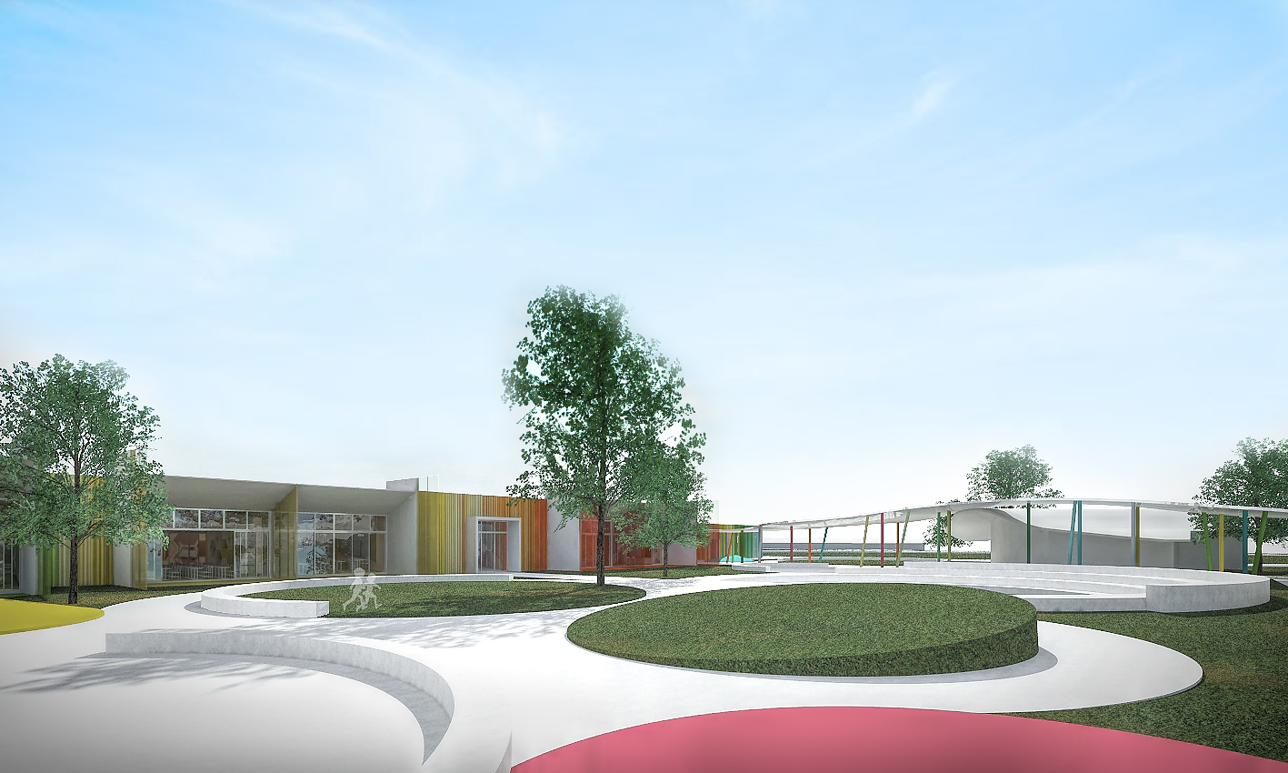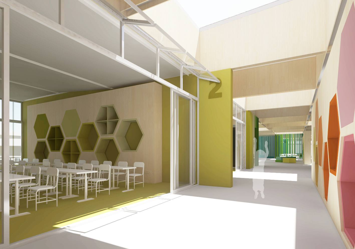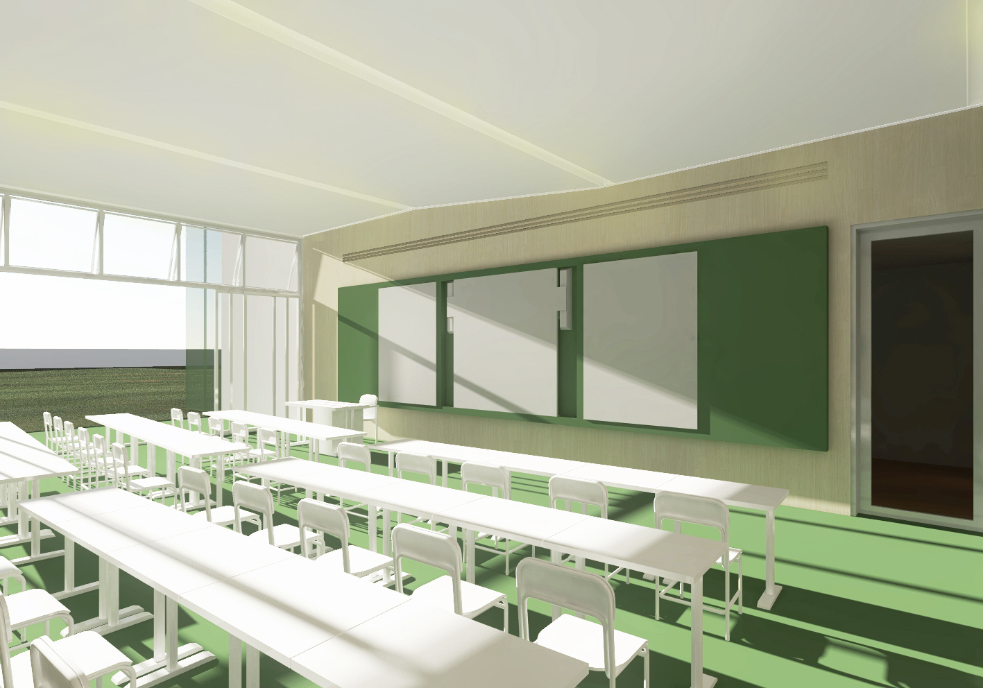 The new school building will assume an important role as a bonding agent between the open spaces and the other buildings. For this purpose, all the classrooms are directly connected to the indoor and outdoor recreational area.