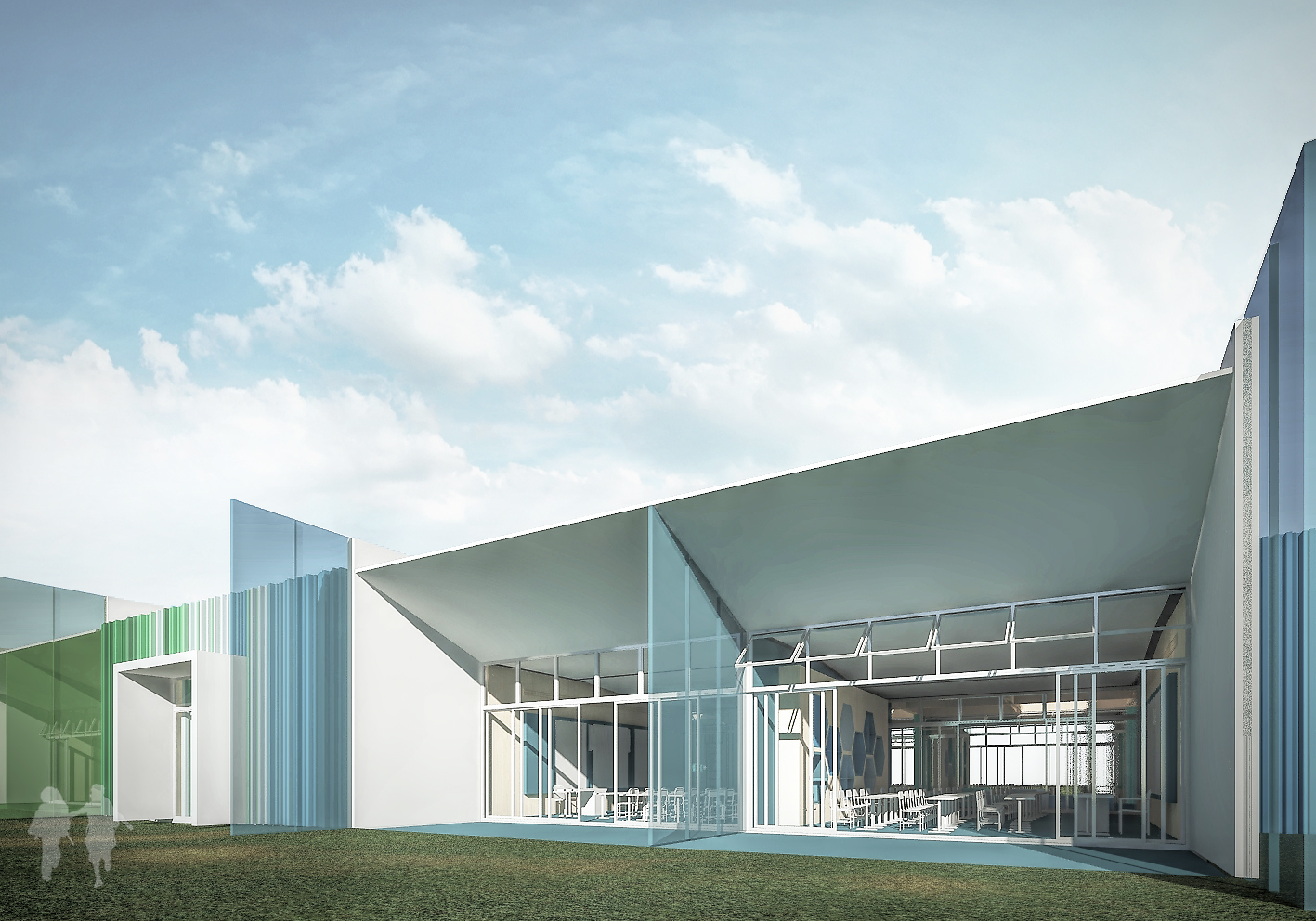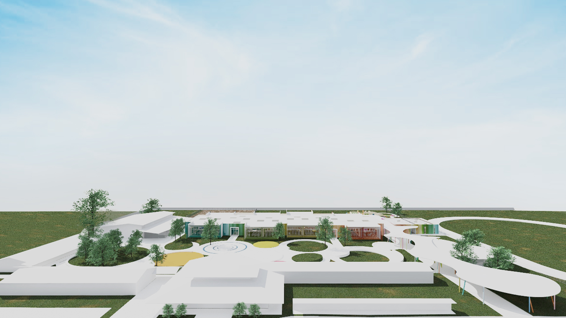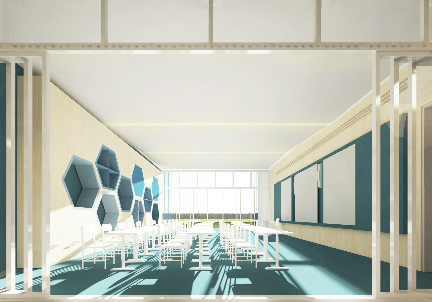 The new school building will assume an important role as a bonding agent between the open spaces and the other buildings. For this purpose, all the classrooms are directly connected to the indoor and outdoor recreational area.