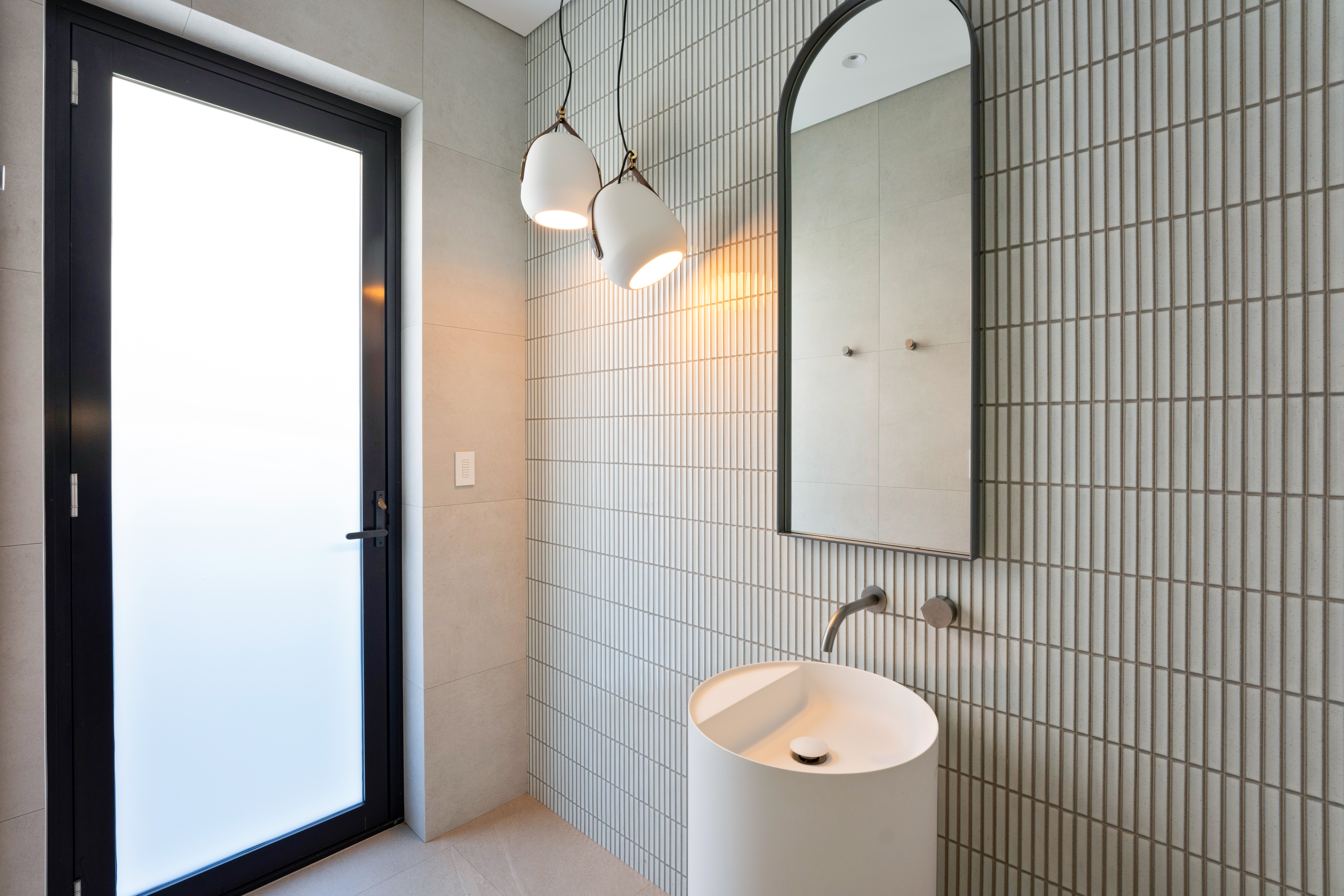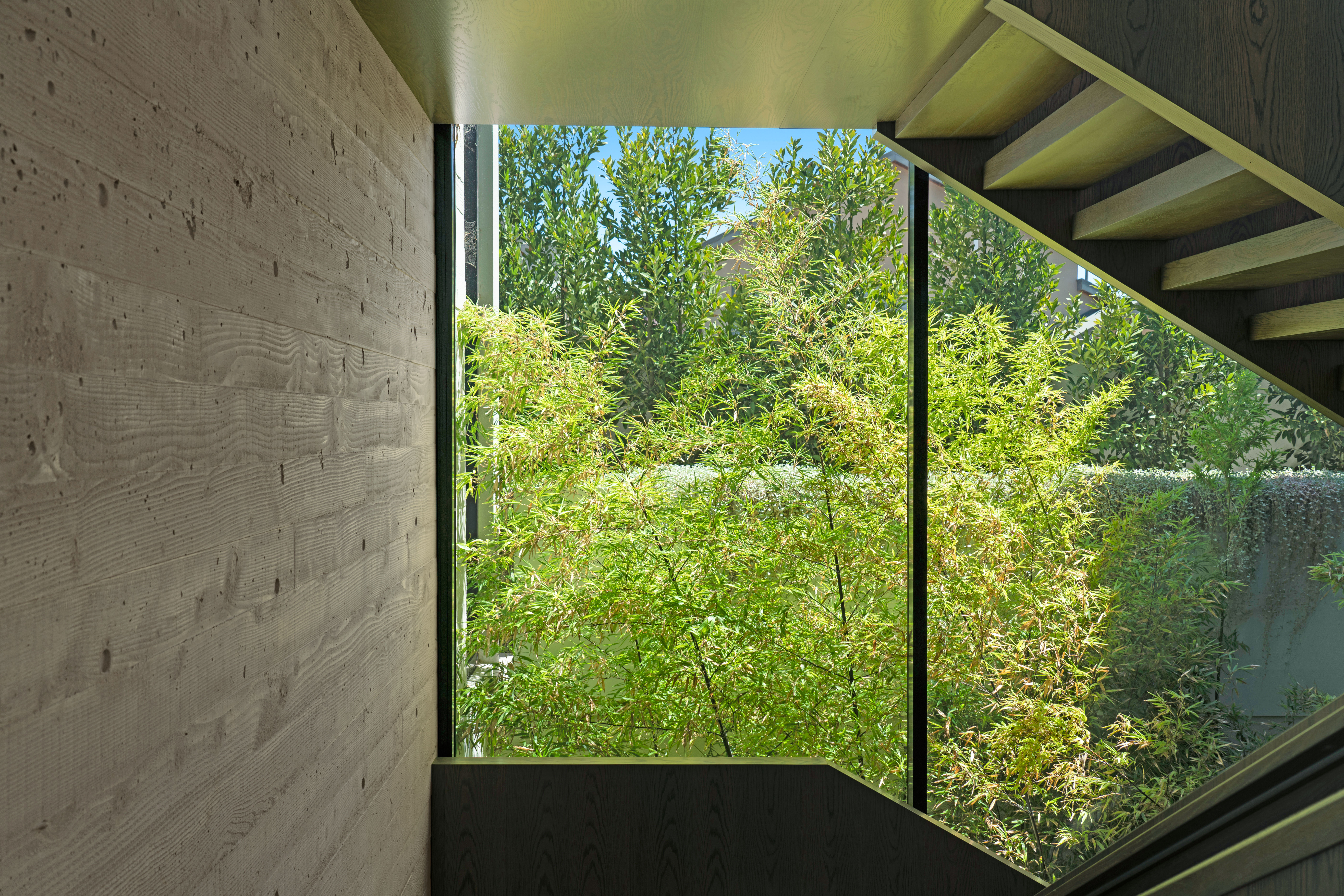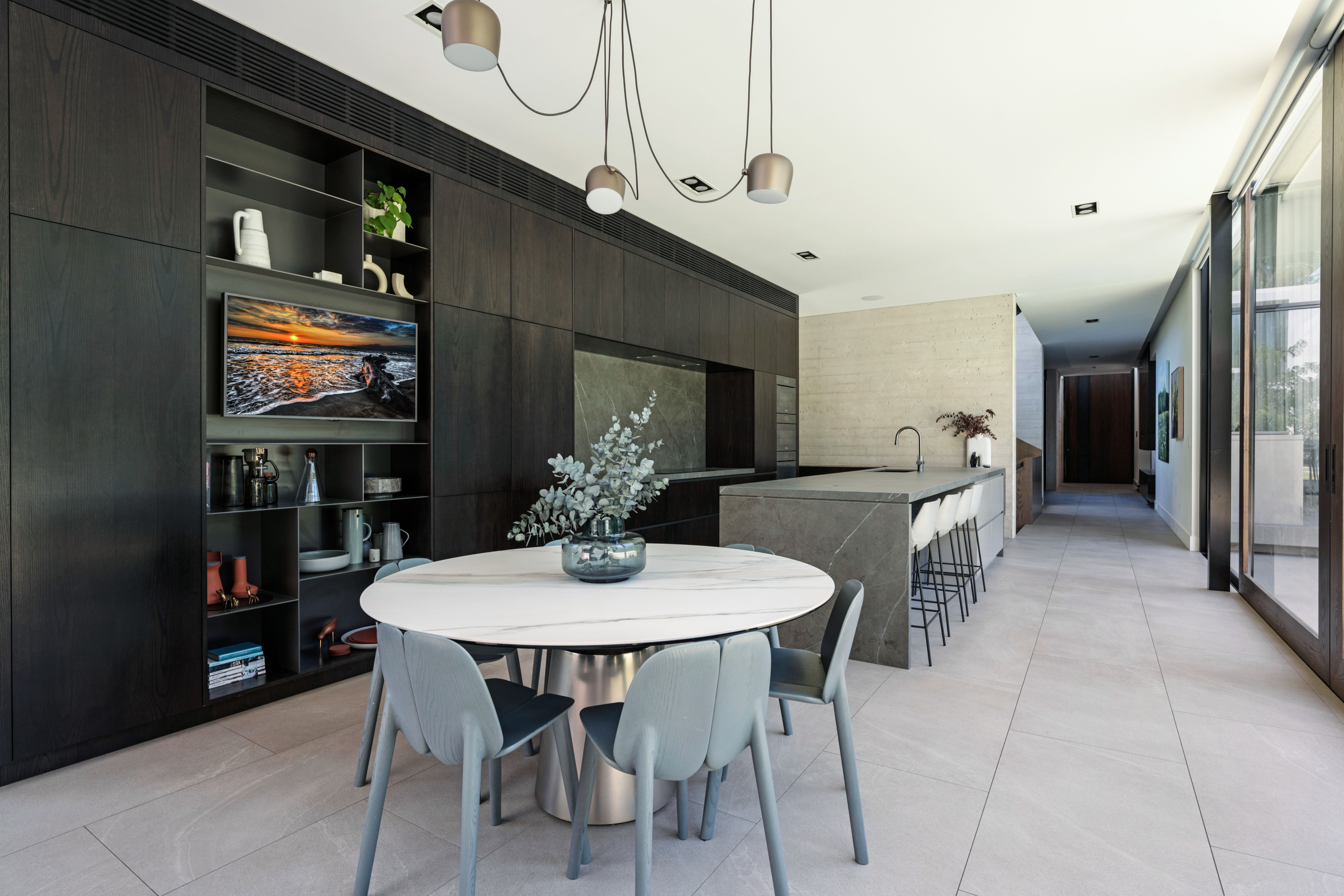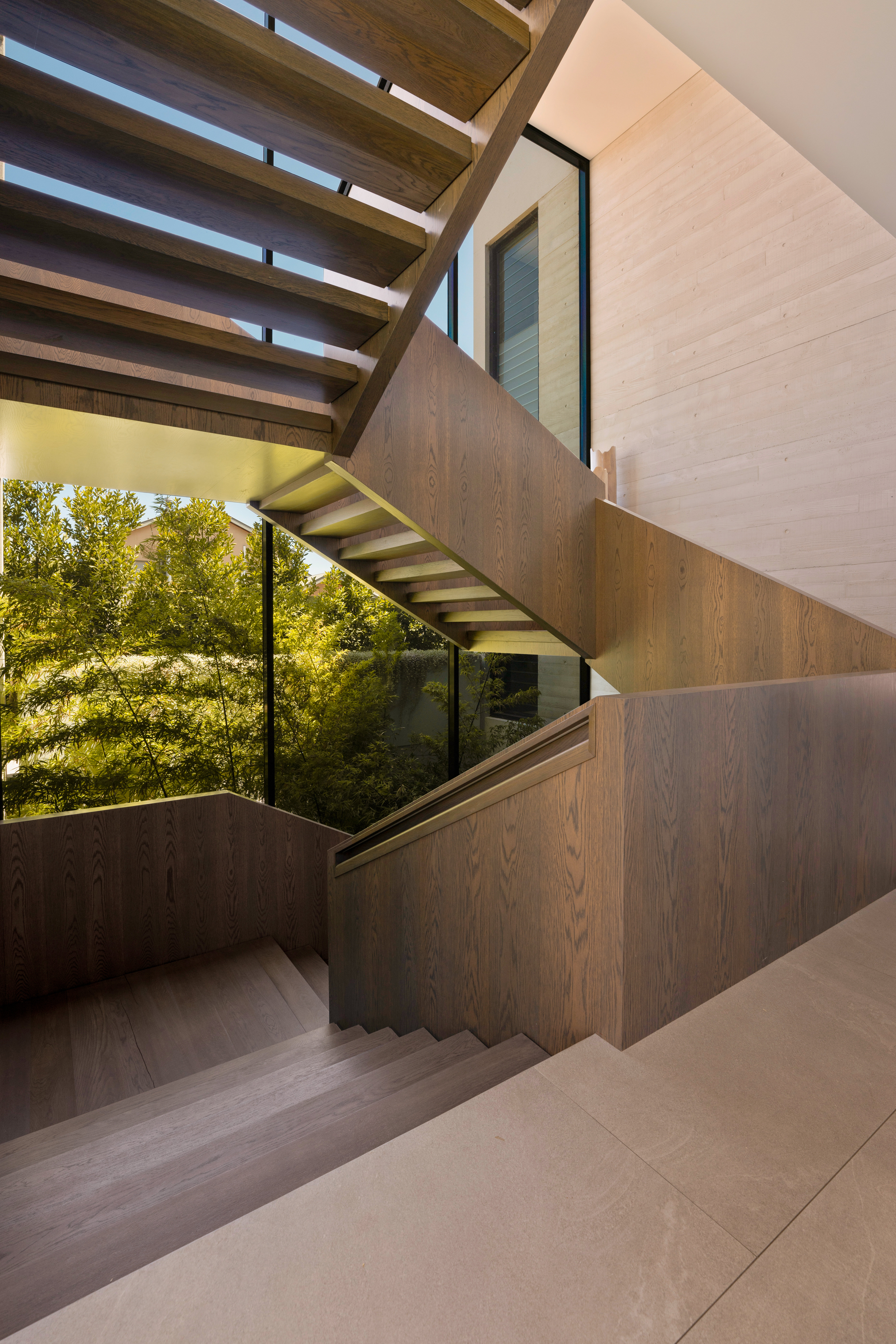 Texture, materiality and light is the design mantra for this contemporary two-level home. The U shaped plan extends the full length of the site enveloping a central outdoor living terrace complete with swimming pool positioned to maximise the benefits of the solar orientation. Off form white concrete contrasts crisp render and expanses of glass where an overlay of custom profiled steel fins define a sense of privacy and enclosure to each of the numerous terraces. The open plan nature of the interior space provides continuity, flow and connection throughout the home.
