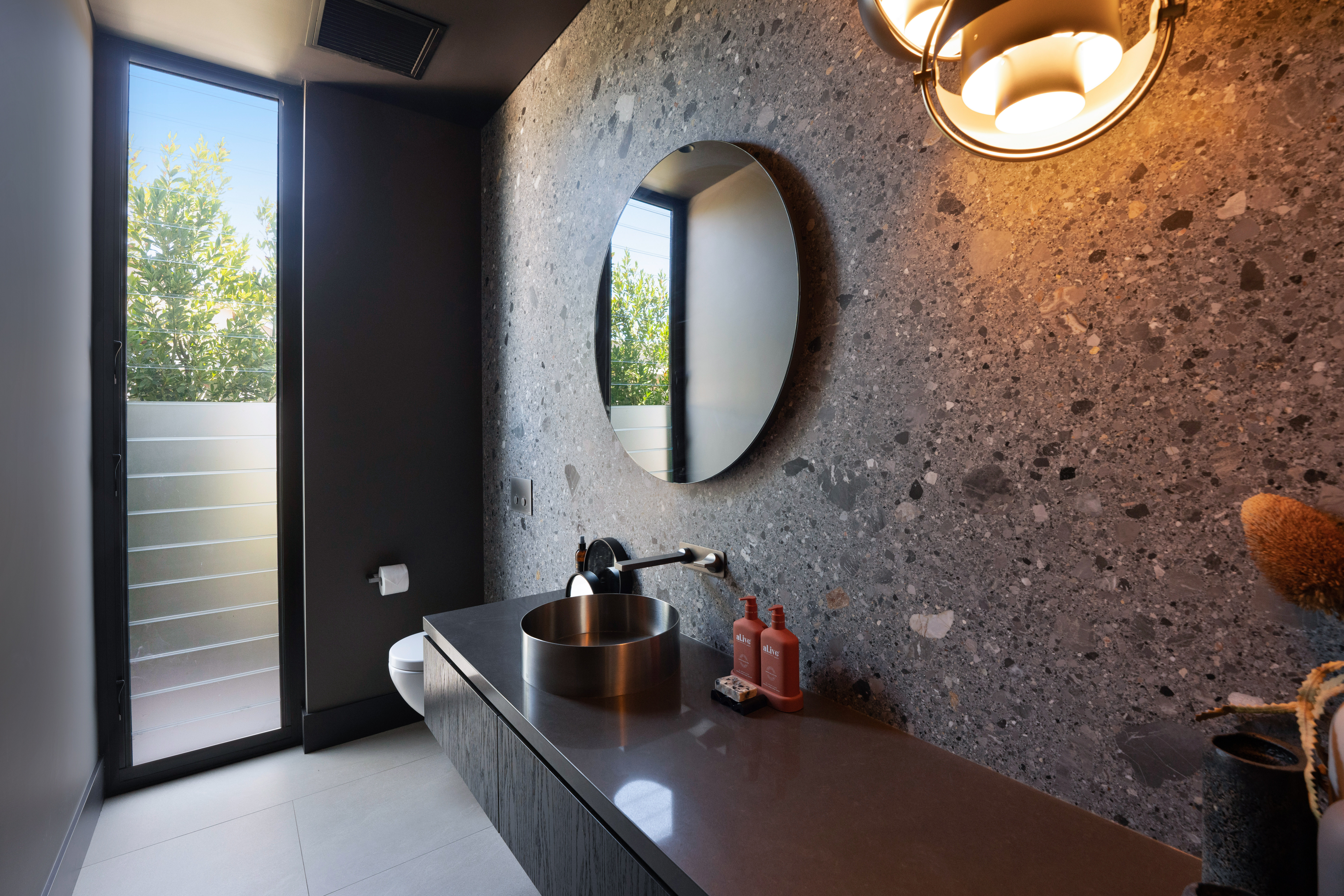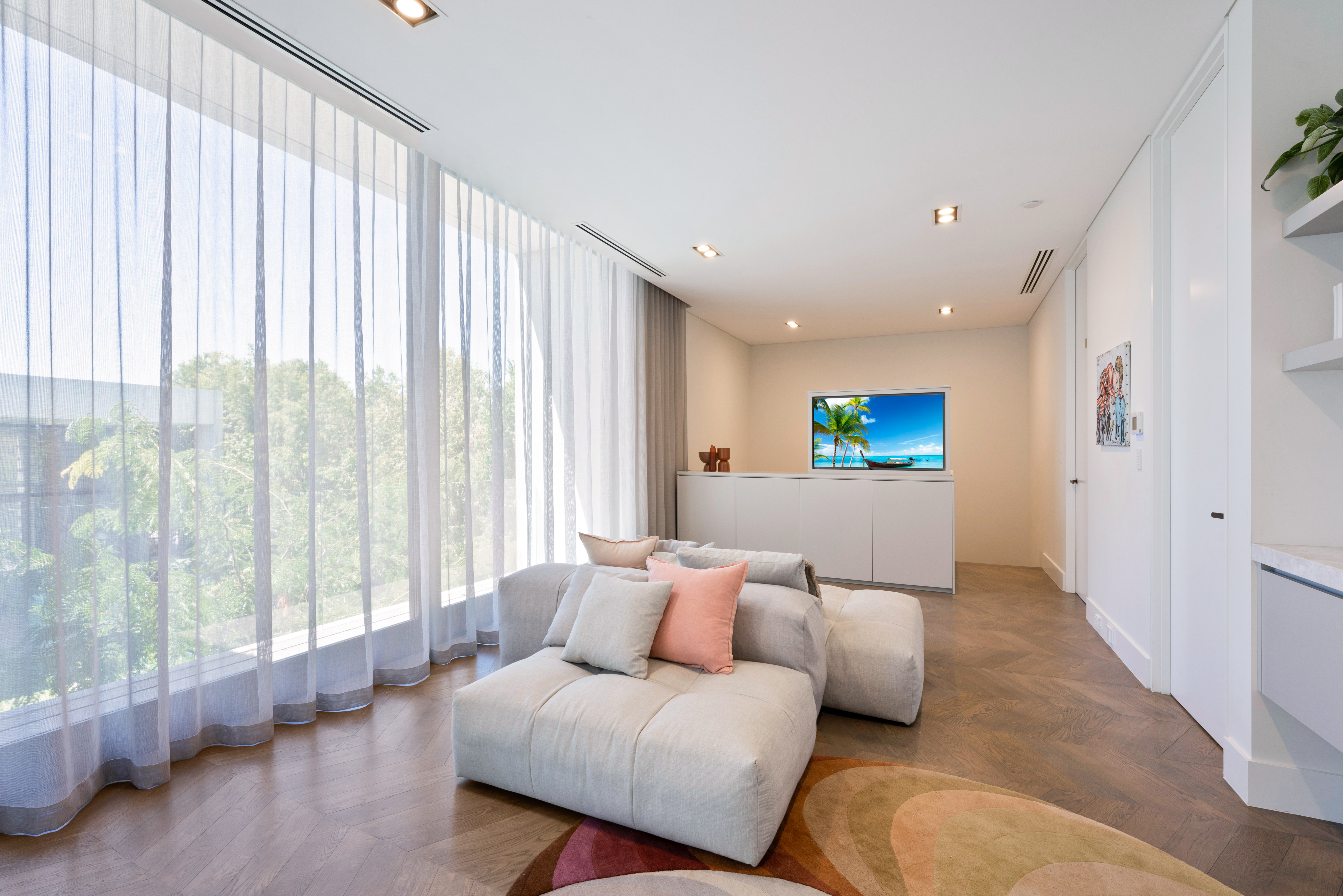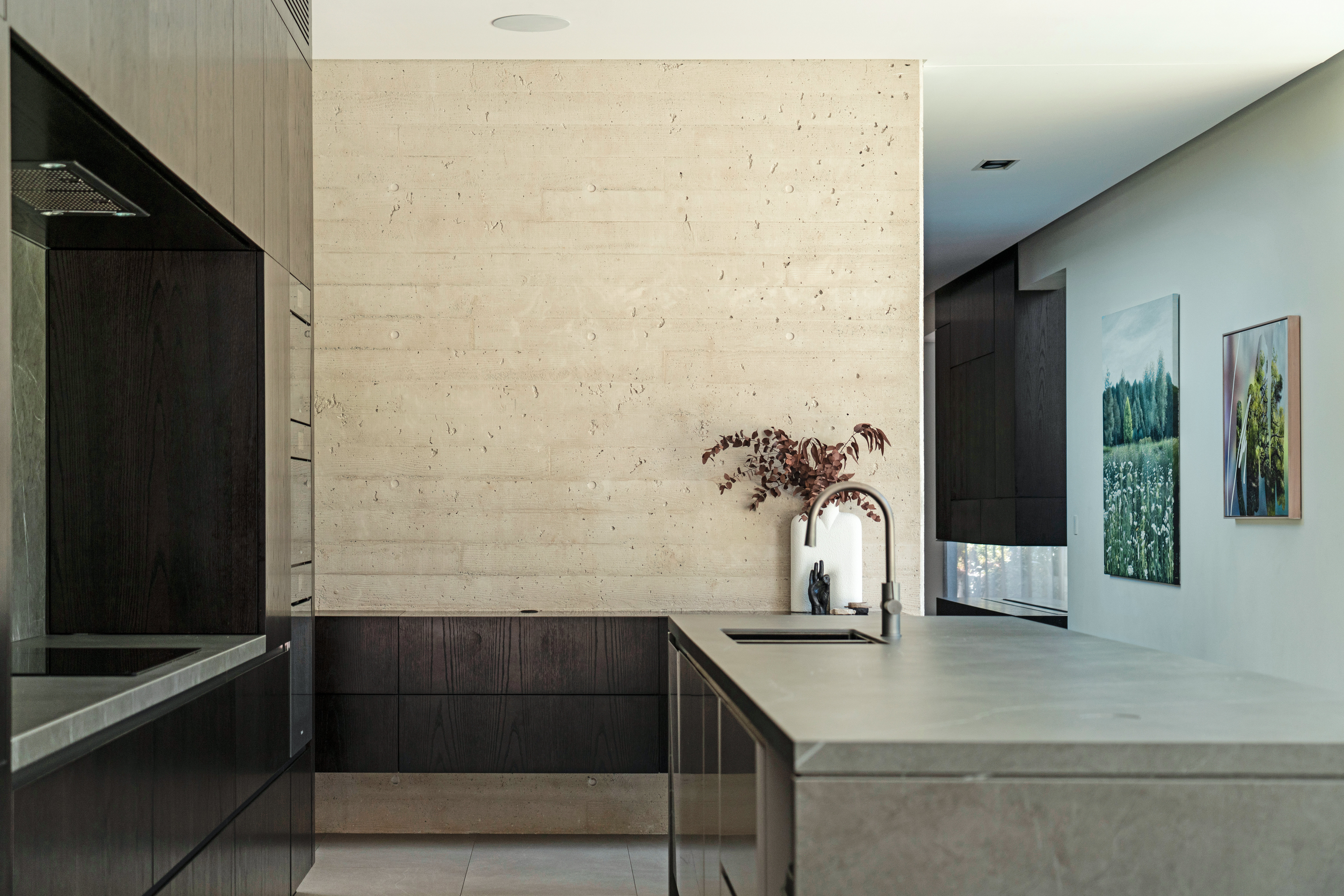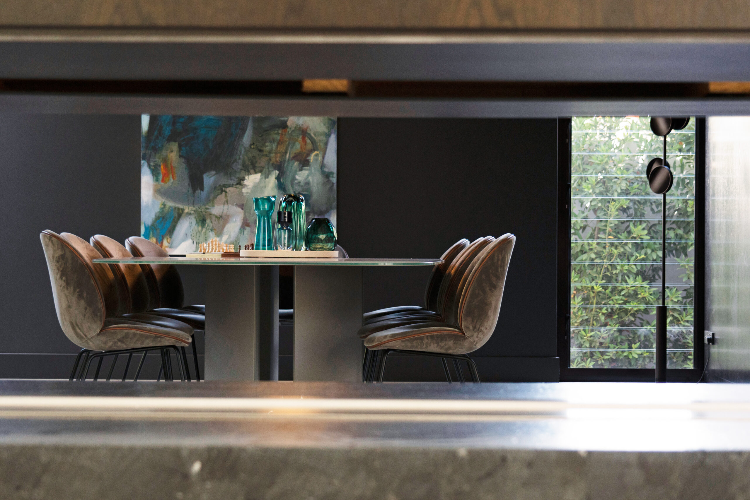 Texture, materiality and light is the design mantra for this contemporary two-level home. The U shaped plan extends the full length of the site enveloping a central outdoor living terrace complete with swimming pool positioned to maximise the benefits of the solar orientation. Off form white concrete contrasts crisp render and expanses of glass where an overlay of custom profiled steel fins define a sense of privacy and enclosure to each of the numerous terraces. The open plan nature of the interior space provides continuity, flow and connection throughout the home.
