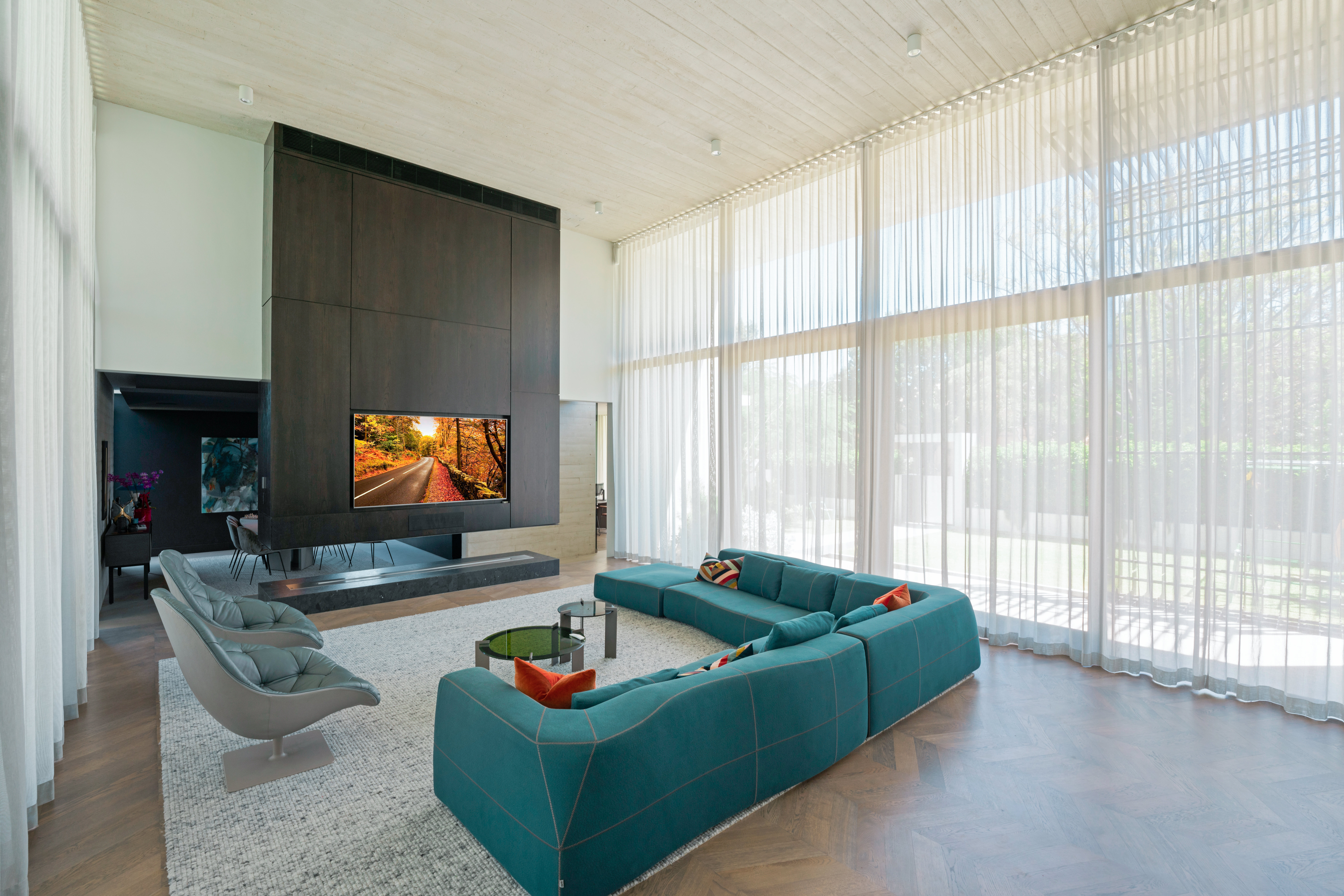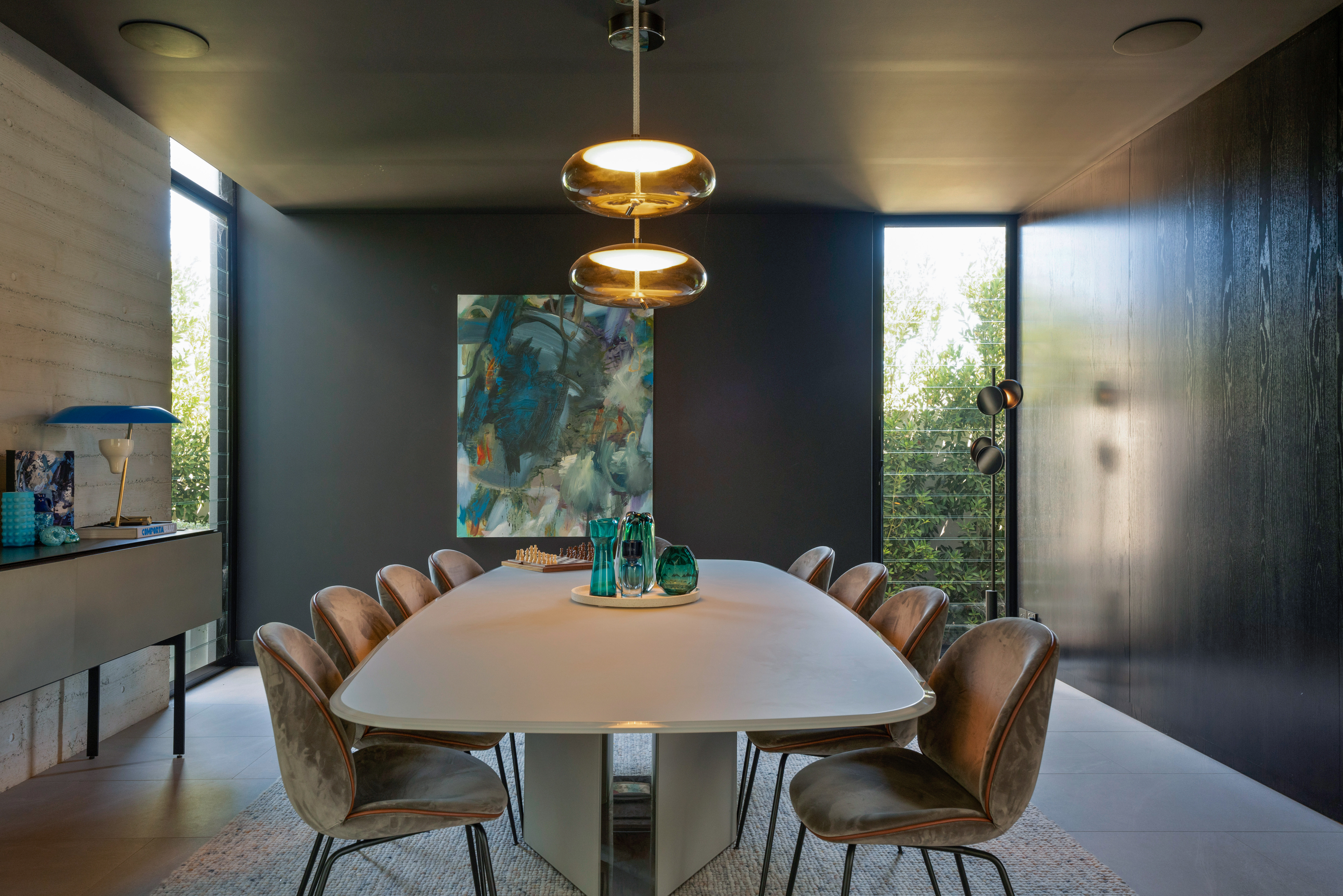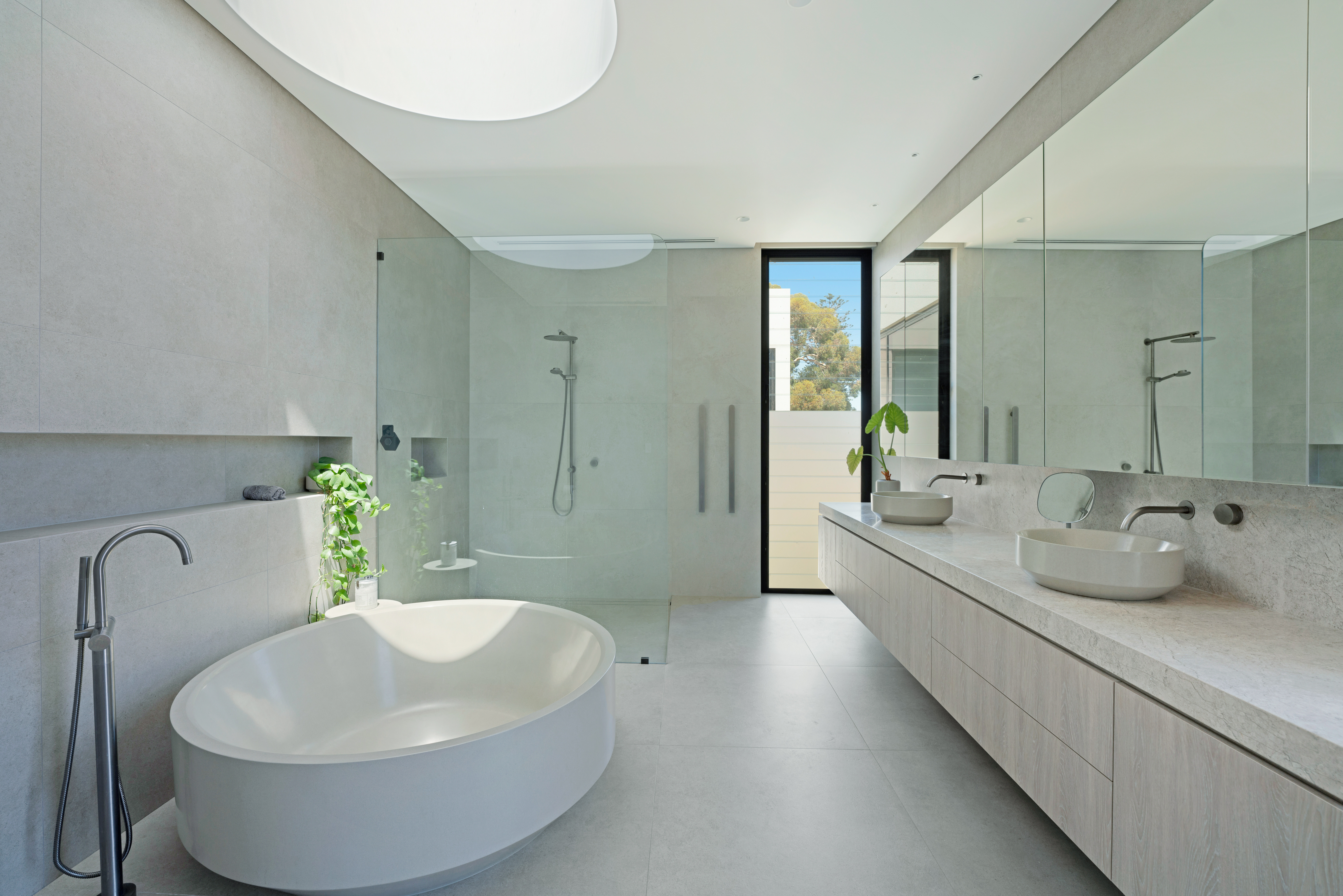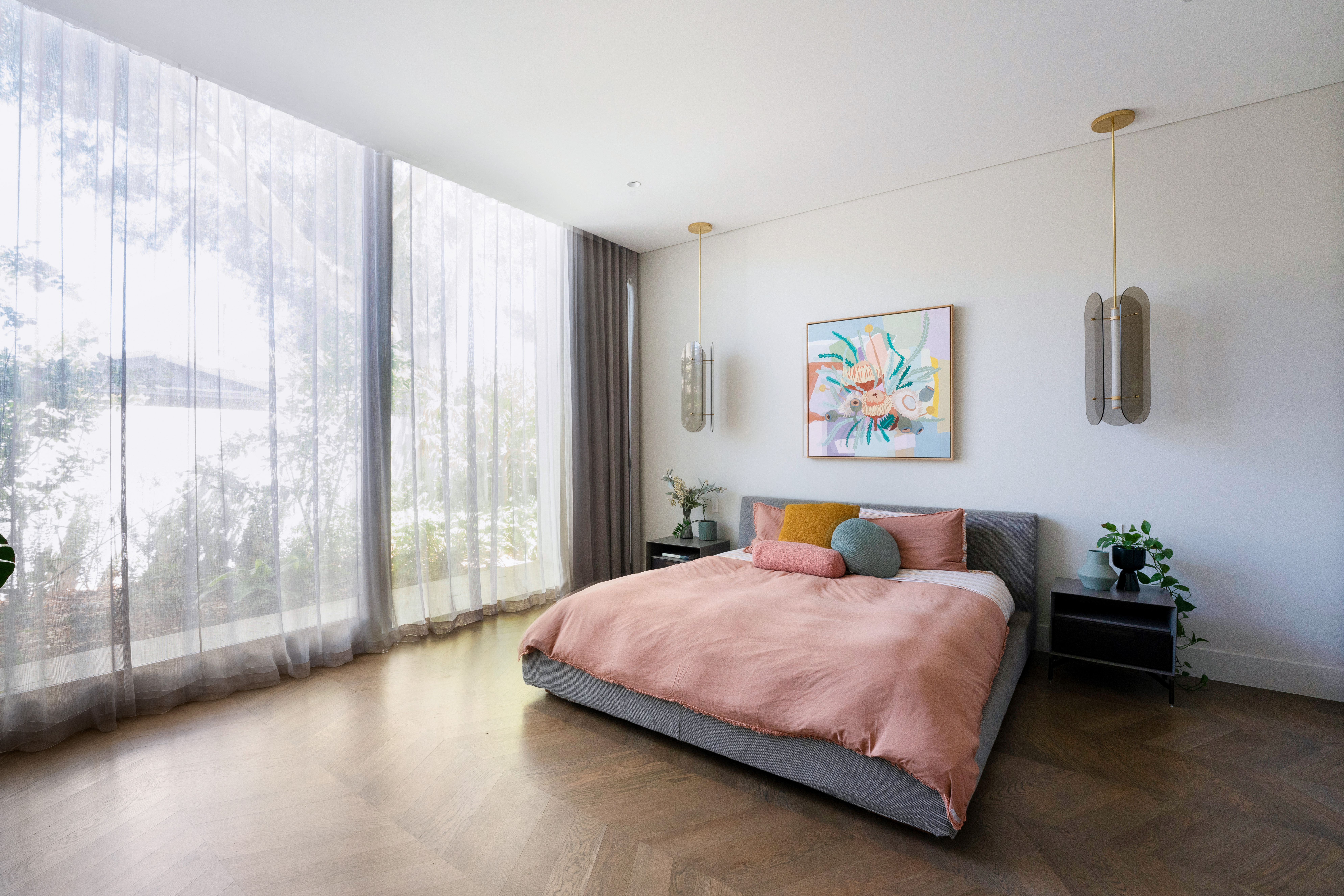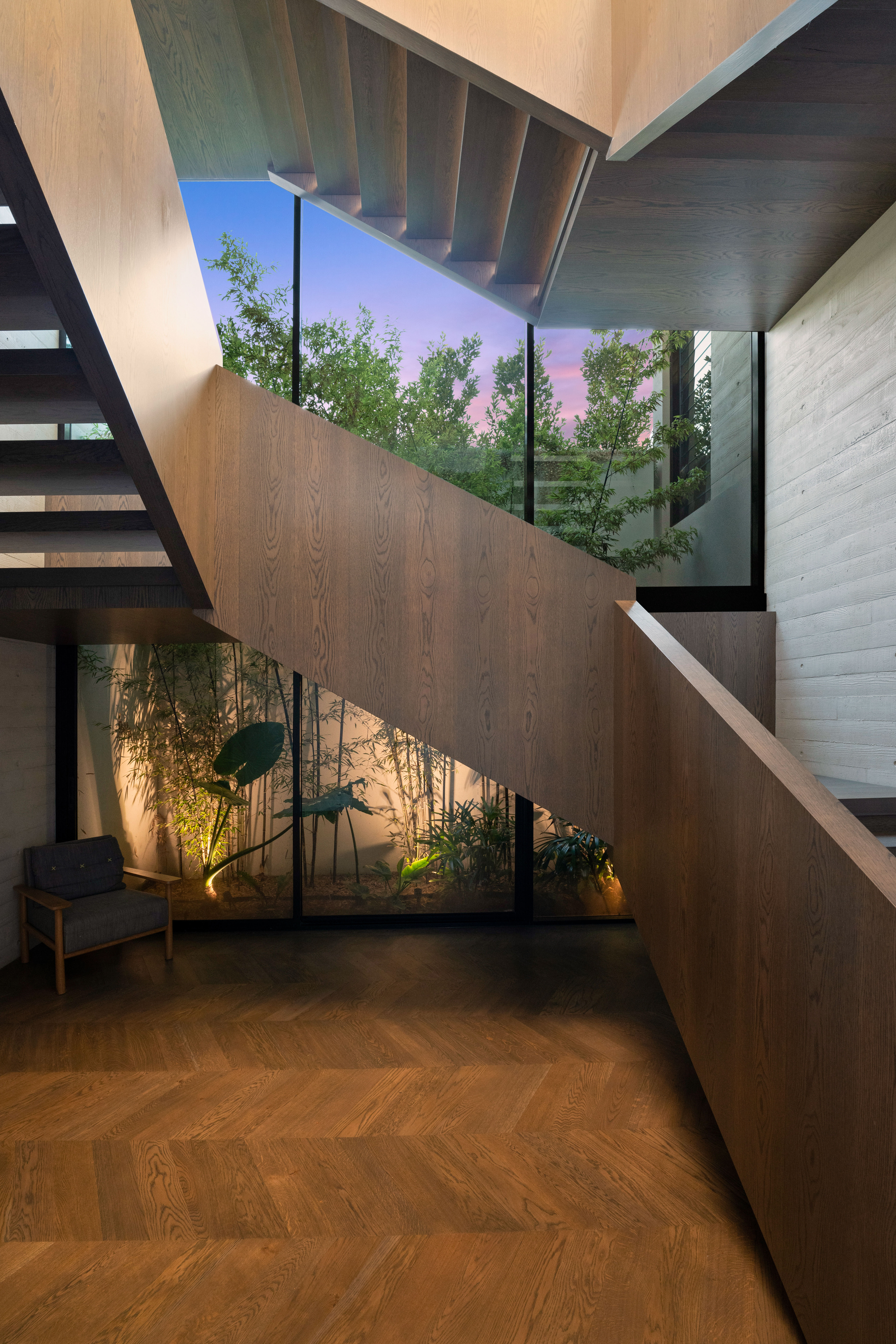 Texture, materiality and light is the design mantra for this contemporary two-level home. The U shaped plan extends the full length of the site enveloping a central outdoor living terrace complete with swimming pool positioned to maximise the benefits of the solar orientation. Off form white concrete contrasts crisp render and expanses of glass where an overlay of custom profiled steel fins define a sense of privacy and enclosure to each of the numerous terraces. The open plan nature of the interior space provides continuity, flow and connection throughout the home.