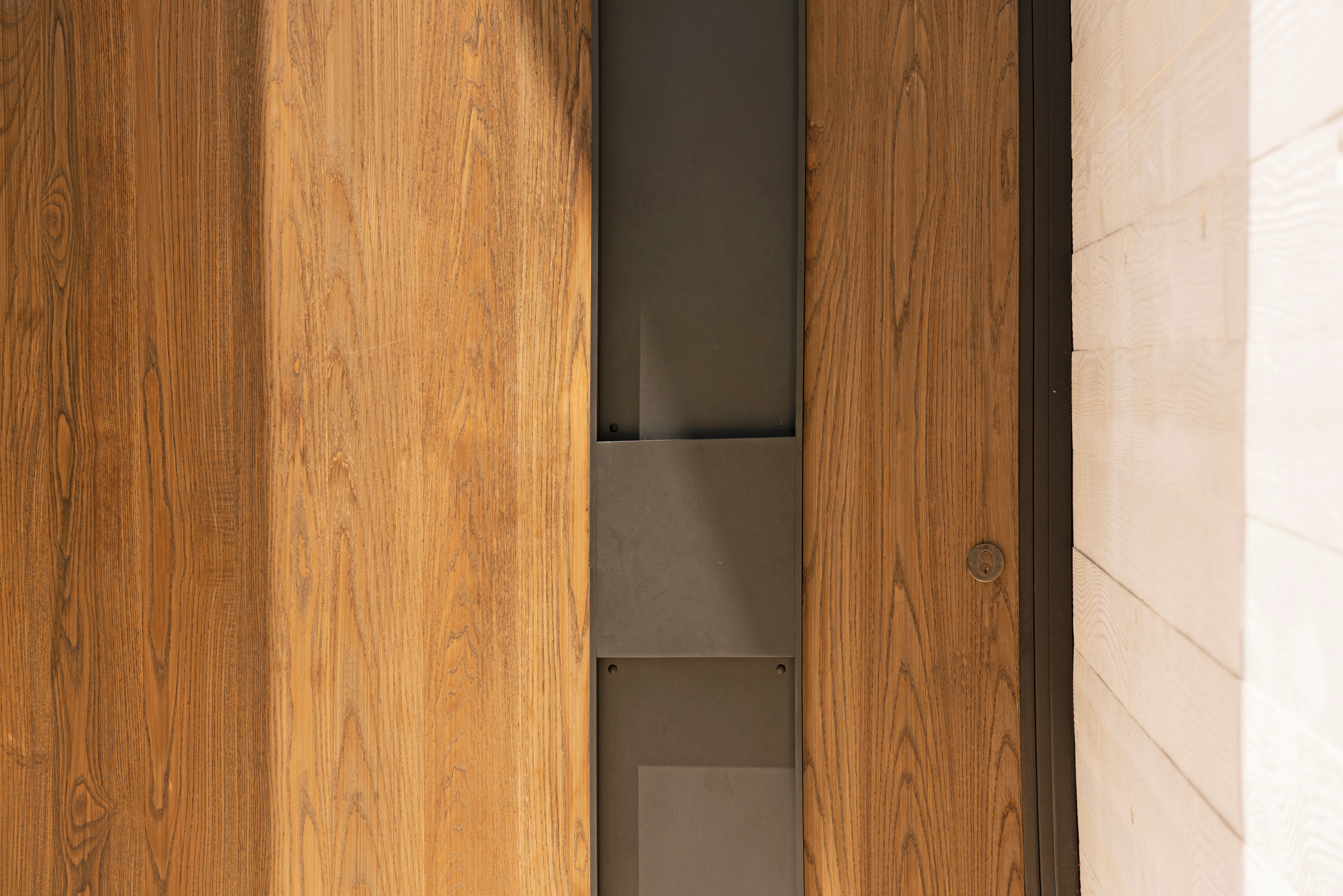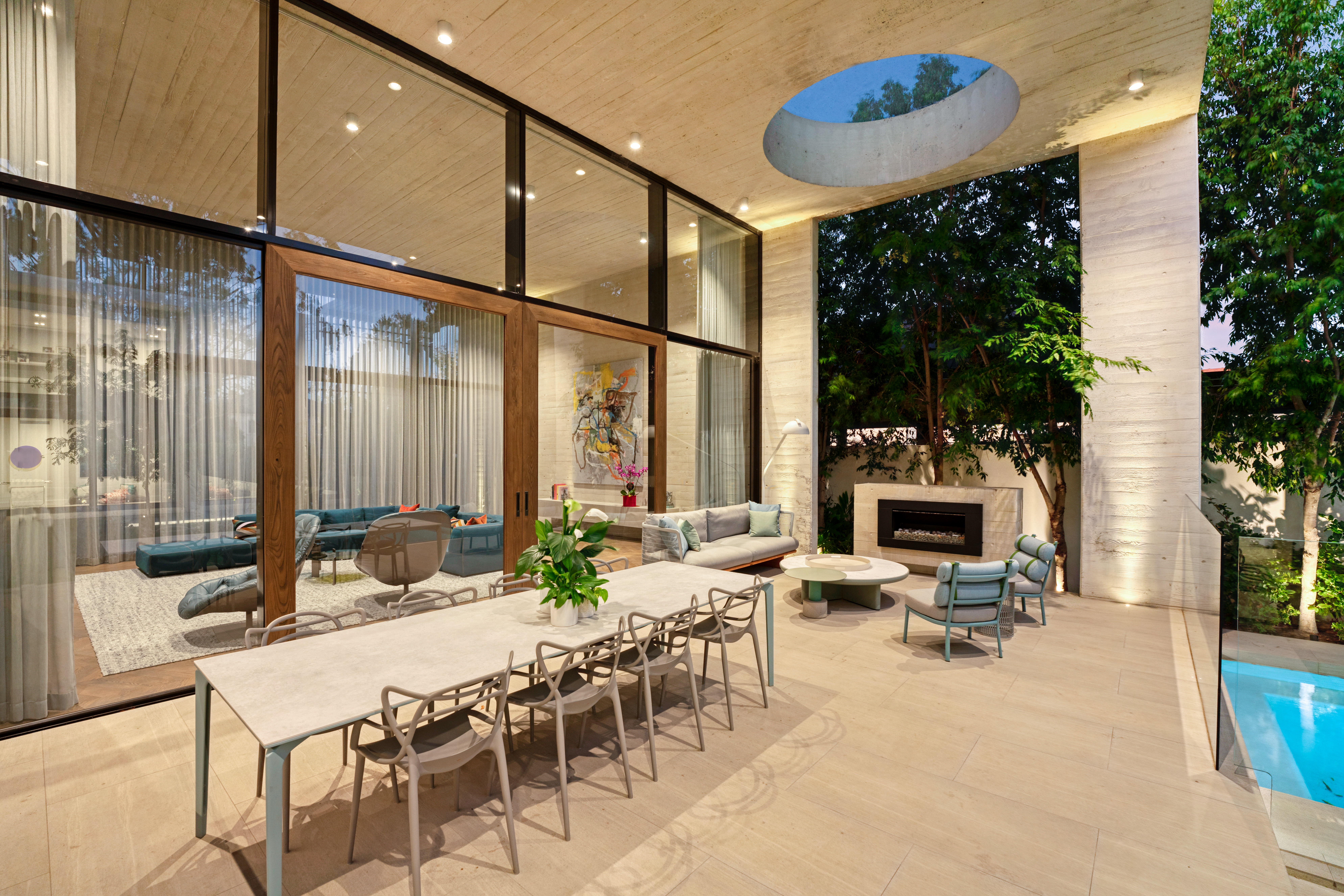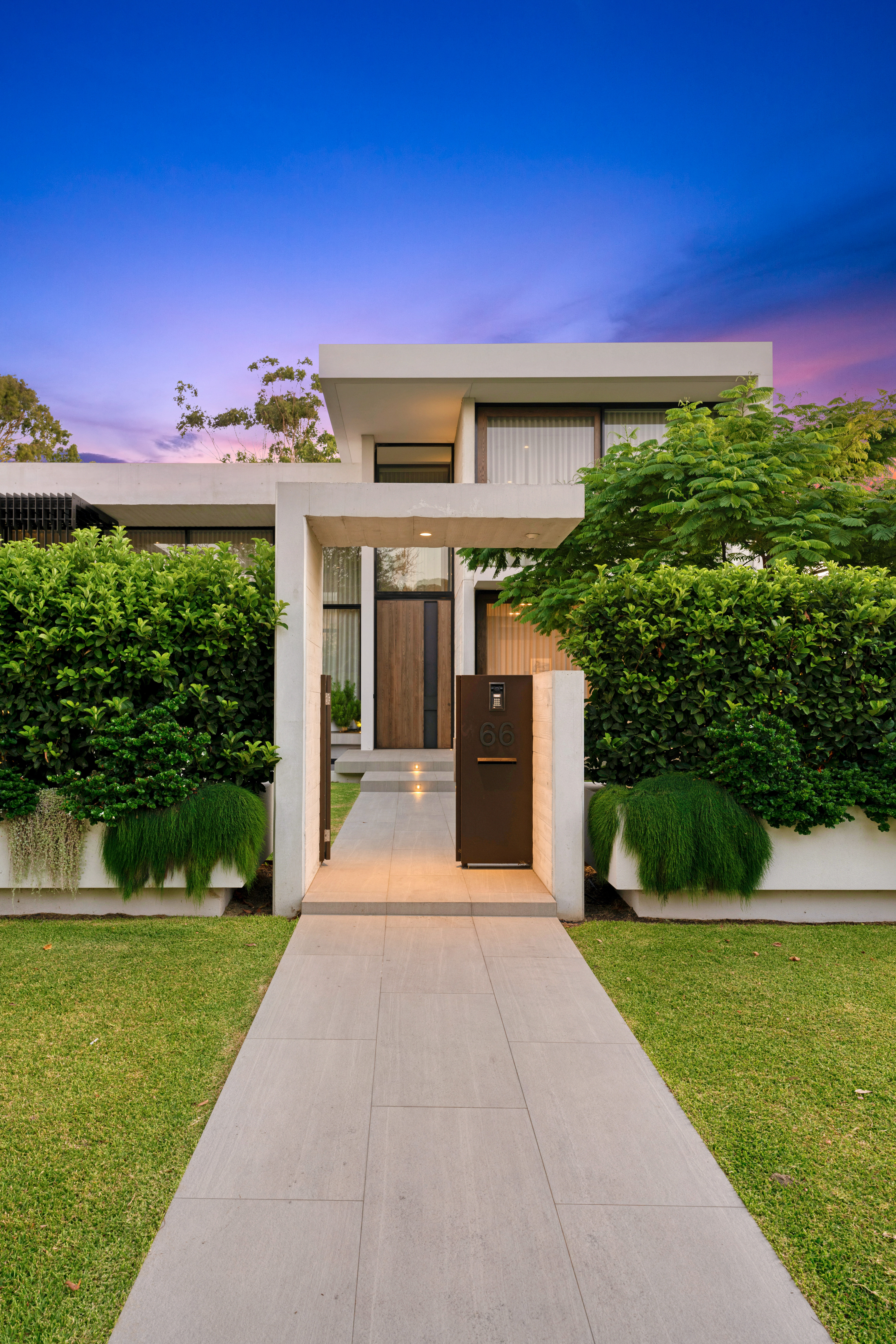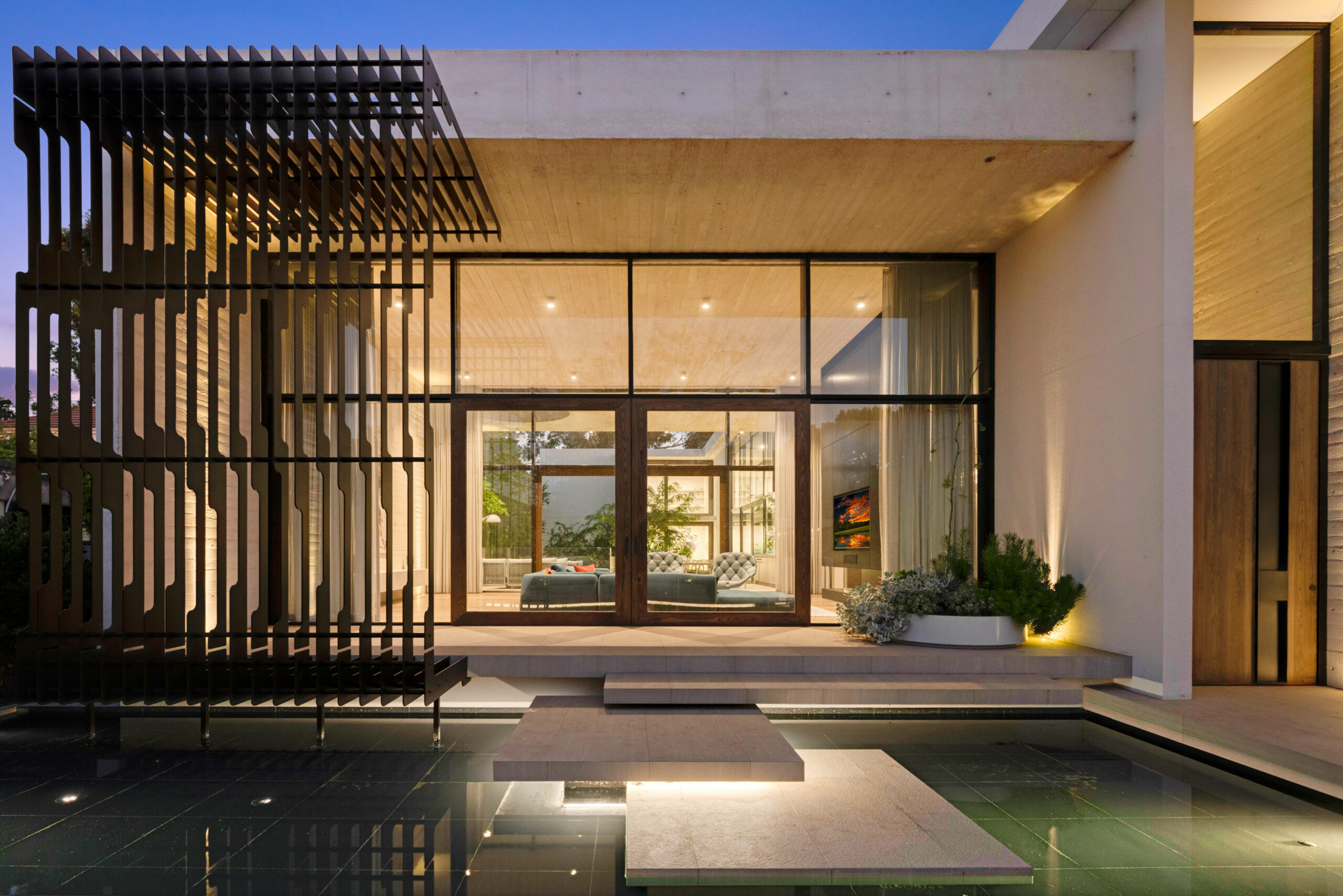 Texture, materiality and light is the design mantra for this contemporary two-level home. The U shaped plan extends the full length of the site enveloping a central outdoor living terrace complete with swimming pool positioned to maximise the benefits of the solar orientation. Off form white concrete contrasts crisp render and expanses of glass where an overlay of custom profiled steel fins define a sense of privacy and enclosure to each of the numerous terraces. The open plan nature of the interior space provides continuity, flow and connection throughout the home.